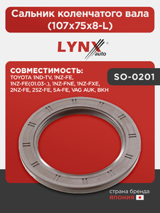 Сальник коленчатого вала (107x75x8-L) LYNXauto SO-0201. Для: TOYOTA Тойота 1ND-TV, 1NZ-FE, 1NZ-FE(01.03-.), 1NZ-FNE, 1NZ-FX(ФХ)E, 2NZ-FE, 2SZ-FE, 5A-FE, VAG AUK, BKH
