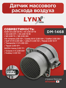 Датчик массового расхода воздуха LYNXauto DM-1468. Для: Audi, Ауди A3 2.0D 03-16 / A4 2.0D 07-19 / A5 2.0D 07> / A6 2.0D 10-18 / Q3 2.0D 11> / Q5 2.0D 08>, Skoda, Шкода, Karoq(Карог) 2.0D 17> .