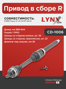 Привод в сборе R LYNXauto CD-1006. Для: Ford, Форд, Focus(Фокус) II 1.4-1.8 MT 04-12. Длина, мм 899-944. Резьба 1 FM10. Шлицы со стороны колеса, шт. 36. Шлицы со стороны трансмиссии, шт. 23.