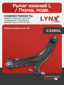 Рычаг нижний L / Перед. подв. LYNXauto C5260L. Для: Nissan, Ниссан, X-Trail(Икс-Траил)(T31) 2.0-2.5 07> / Qashqai(Кашкай)(J10) 1.5D-2.0D 07>, Renaul, Рено, Koleos 2.0D-2.5 08>. Размер конуса d, мм- 20