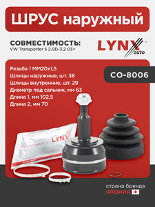 ШРУС наружный LYNXauto CO-8006. Для: VW, Фольксваген, Transporter(Транспортер) 5 2.0D-3.2 03>. Резьба 1 MM20x1,5. Шлицы наружные, шт. 38. Шлицы внутренние, шт. 29.