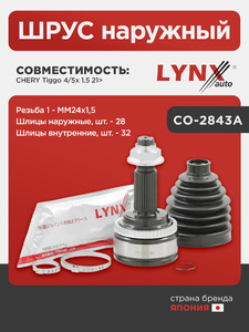 ШРУС наружный LYNXauto CO-2843A. Для: Chery, Чери, Tiggo(Тиго) 4/5x 1.5 21>. Резьба 1 - MM24x1,5. Шлицы наружные, шт. - 28. Шлицы внутренние, шт. - 32.