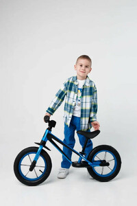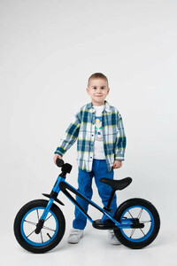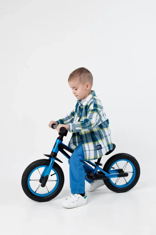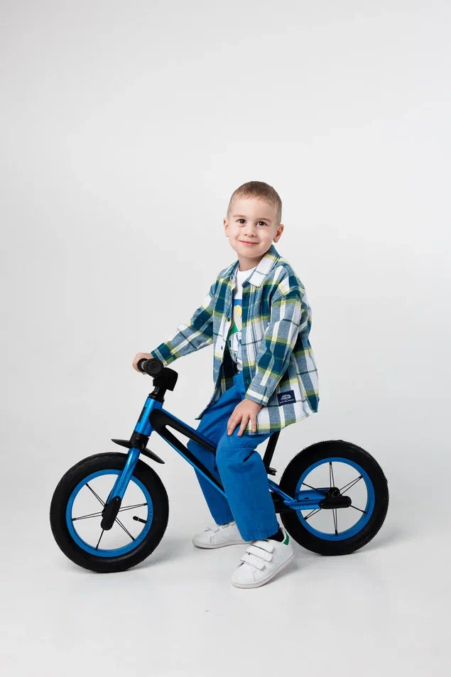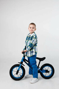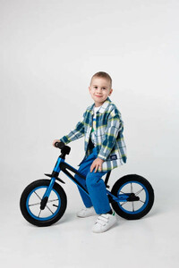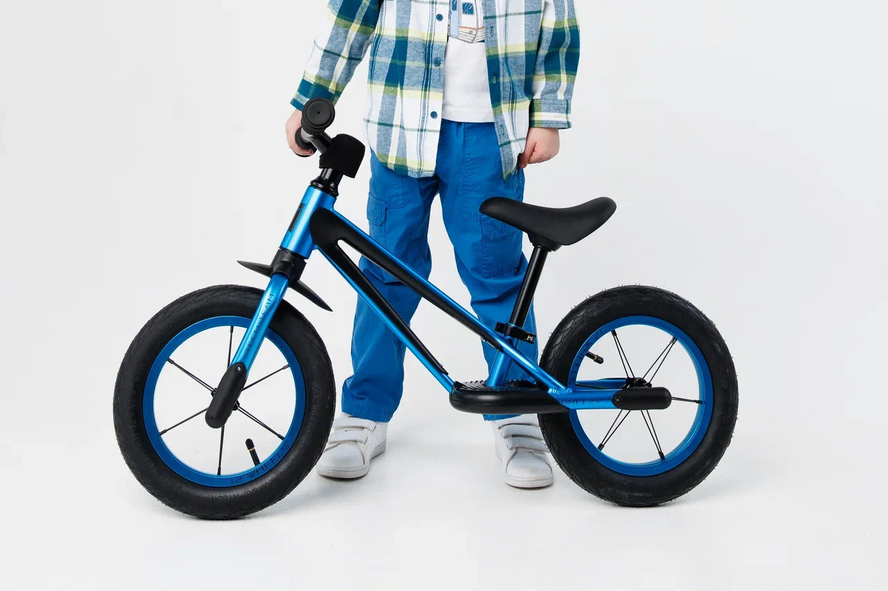 У двухколесного велосипеда без педалей легкий вес, всего 2,8 кг. Диаметр колес 12 дюймов. Вилка, обода, втулки и руль выполнены из алюминия, подселельный штырь встроен с сиденьем. Удобное мягкое эргономичное сиденье, с углублениями под пальцы для удобной переноски и легкой и быстрой регулировкой по высоте 31-44 см. Высота руля от пола 54 см. Рама имеет удобные подножки с нескользящим покрытием, чтобы было проще ставить и удерживать ноги при катании, а также переднее крыло, защищающее от грязи, функцию заднего выполняет сиденье.