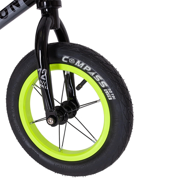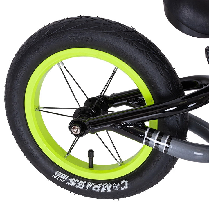 У двухколесного велосипеда без педалей легкий вес, всего 3 кг. Диаметр колес 12 дюймов. Вилка, обода, втулки и руль выполнены из алюминия, подселельный штырь встроен с сиденьем. Удобное мягкое эргономичное сиденье, с углублениями под пальцы для удобной переноски и легкой и быстрой регулировкой по высоте 38-47 см. Высота руля от пола 57 см. Рама имеет удобные подножки с нескользящим покрытием, чтобы было проще ставить и удерживать ноги при катании, а также переднее крыло, защищающее от грязи, функцию заднего выполняет сиденье.