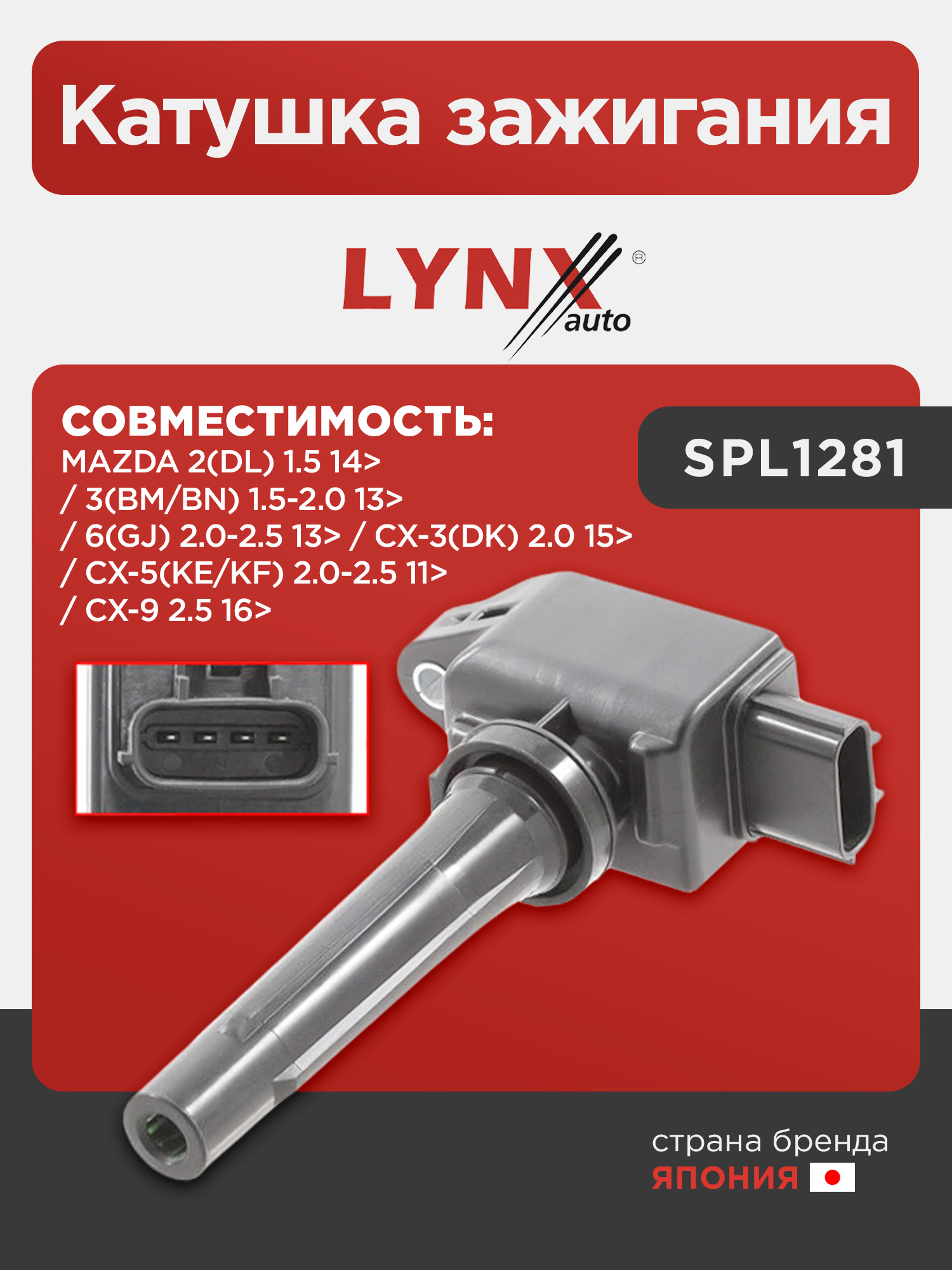Катушка зажигания LYNXauto SPL1281. Для: MAZDA(Мазда) 2(DL) 1.5 14> / 3(BM/BN) 1.5-2.0 13> / 6(GJ) 2.0-2.5 13> / CX-3(DK) 2.0 15> / CX-5(KE/KF) 2.0-2.5 11> / CX-9 2.5 16>
