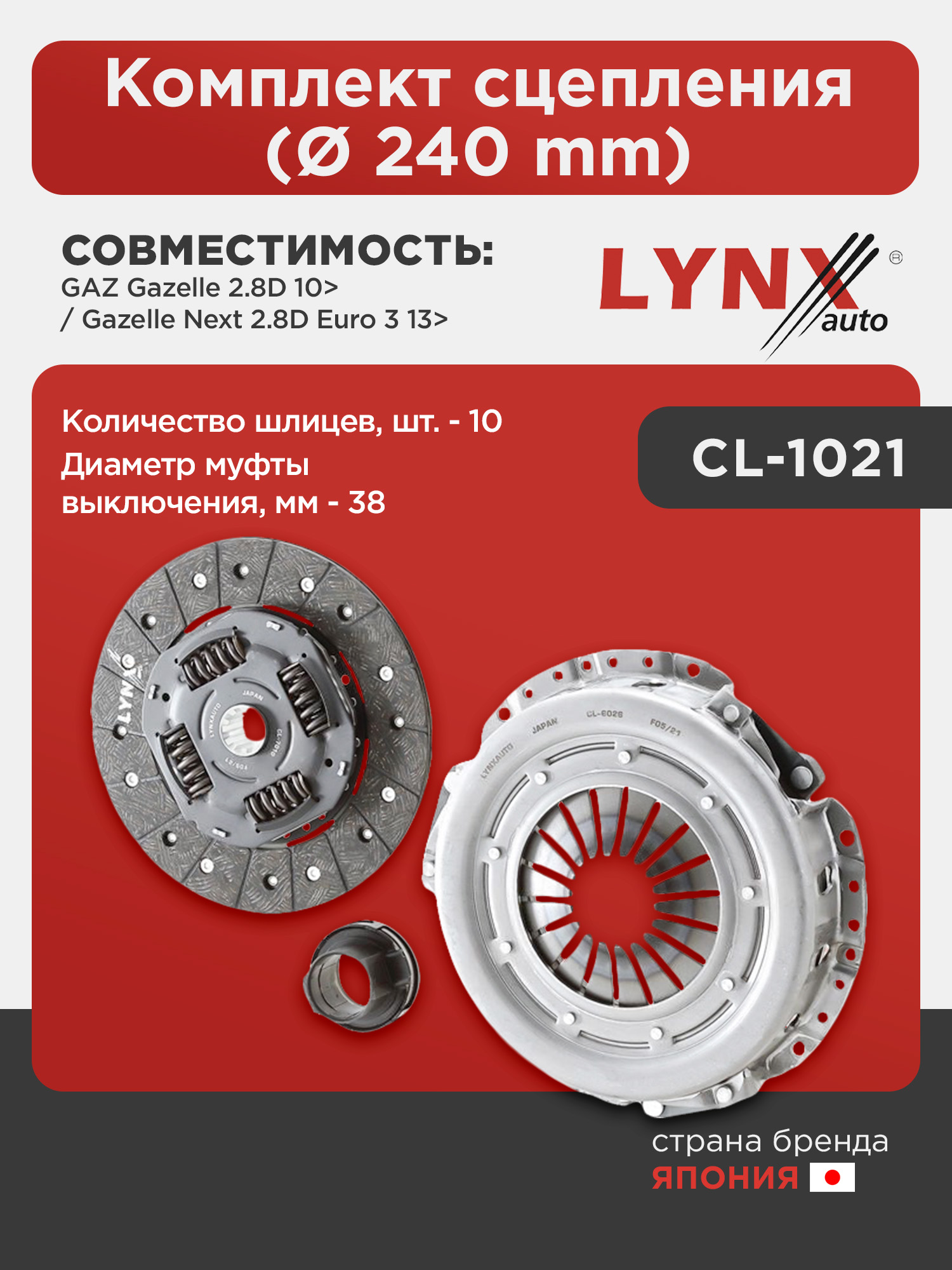 Комплект сцепления (Ø 240 mm) LYNXauto CL-1021. Для: Gaz, ГАЗ, Gaz, Газель 2.8D 10> / Gaz, Газель Next 2.8D Euro 3 13>. Количество шлицев, шт. - 10. Диаметр муфты выключения, мм - 38.