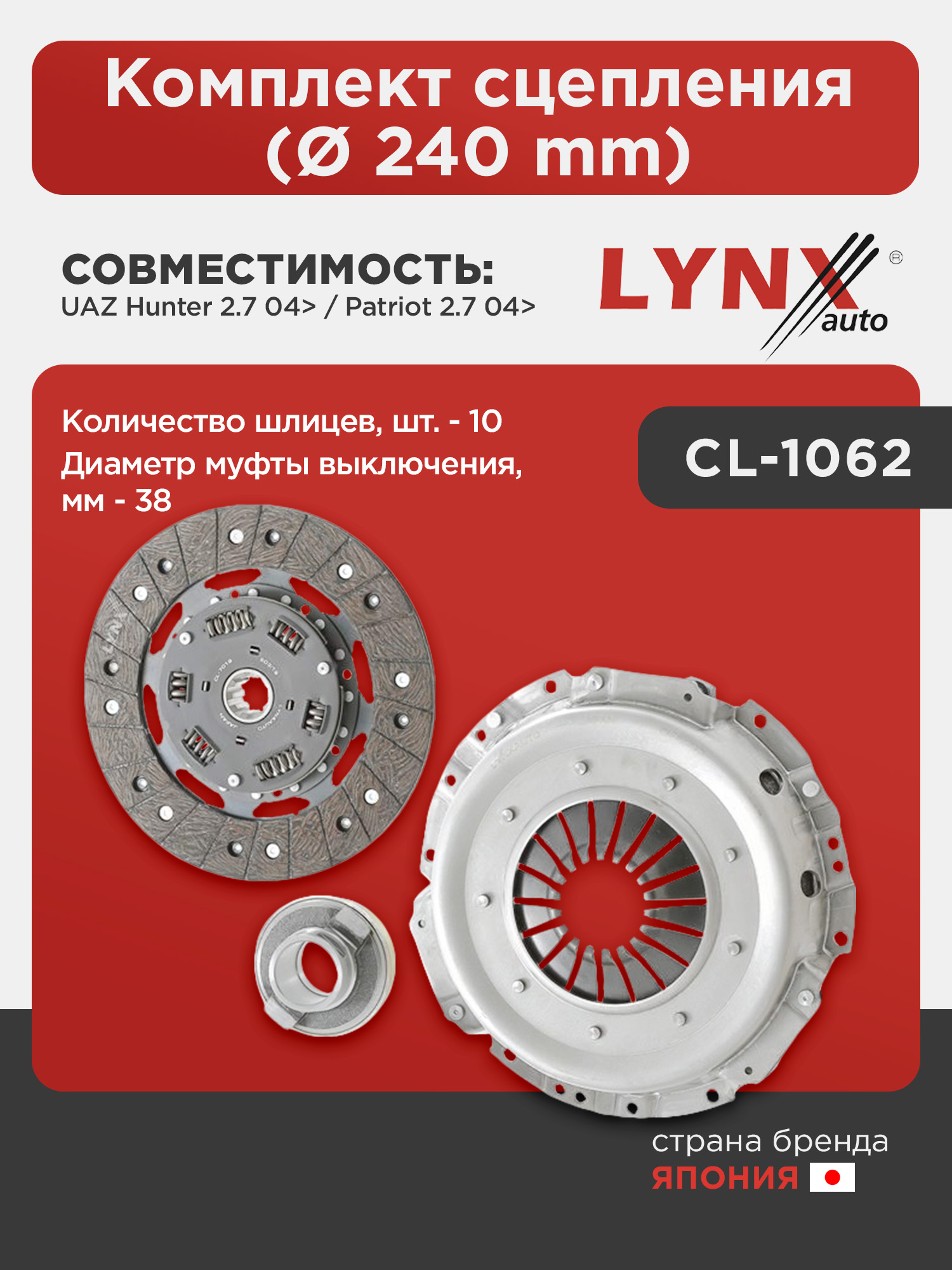 Комплект сцепления (Ø 240 mm) LYNXauto CL-1062. Для: UAZ, УАЗ, Hunter(Хантер) 2.7 04> / Patriot(Патриот) 2.7 04>. Количество шлицев, шт. - 10. Диаметр муфты выключения, мм - 38.