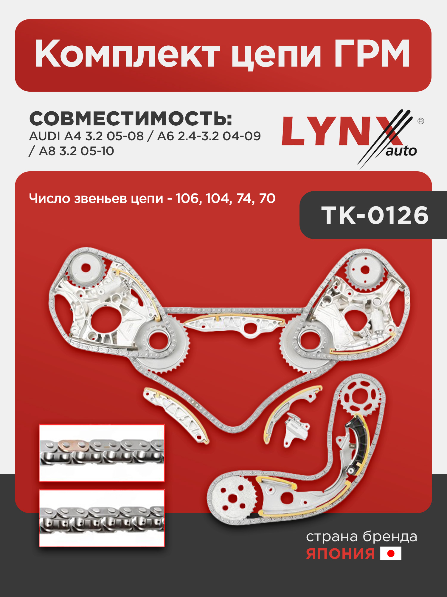 Комплект цепи ГРМ LYNXauto TK-0126. Для: Audi, Ауди A4 3.2 05-08 / A6 2.4-3.2 04-09 / A8 3.2 05-10. Число звеньев цепи- 106, 104, 74, 70.