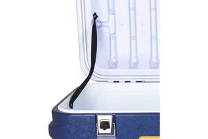 Плотная крышка надежно прилегает к корпусу и фиксируется усиленными железными замками. В крышке есть уплотняющая прокладка. Содержимое будет надежно защищено от случайных открываний и влияния внешней среды. На поверхности крышки нанесена измерительная линейка, и есть два подстаканника.