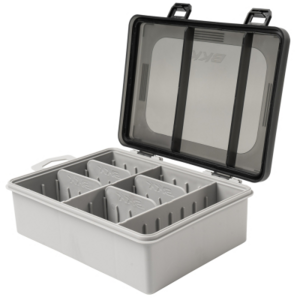 Коробка BKK OCD Tackle System A4 (H-BC-1019) поставляется пустой, внутренние аксессуары продаются отдельно. Вмещает до 24 маленьких (Small) или 14 средних (Medium) внутренних коробочек BKK, или их комбинацию.