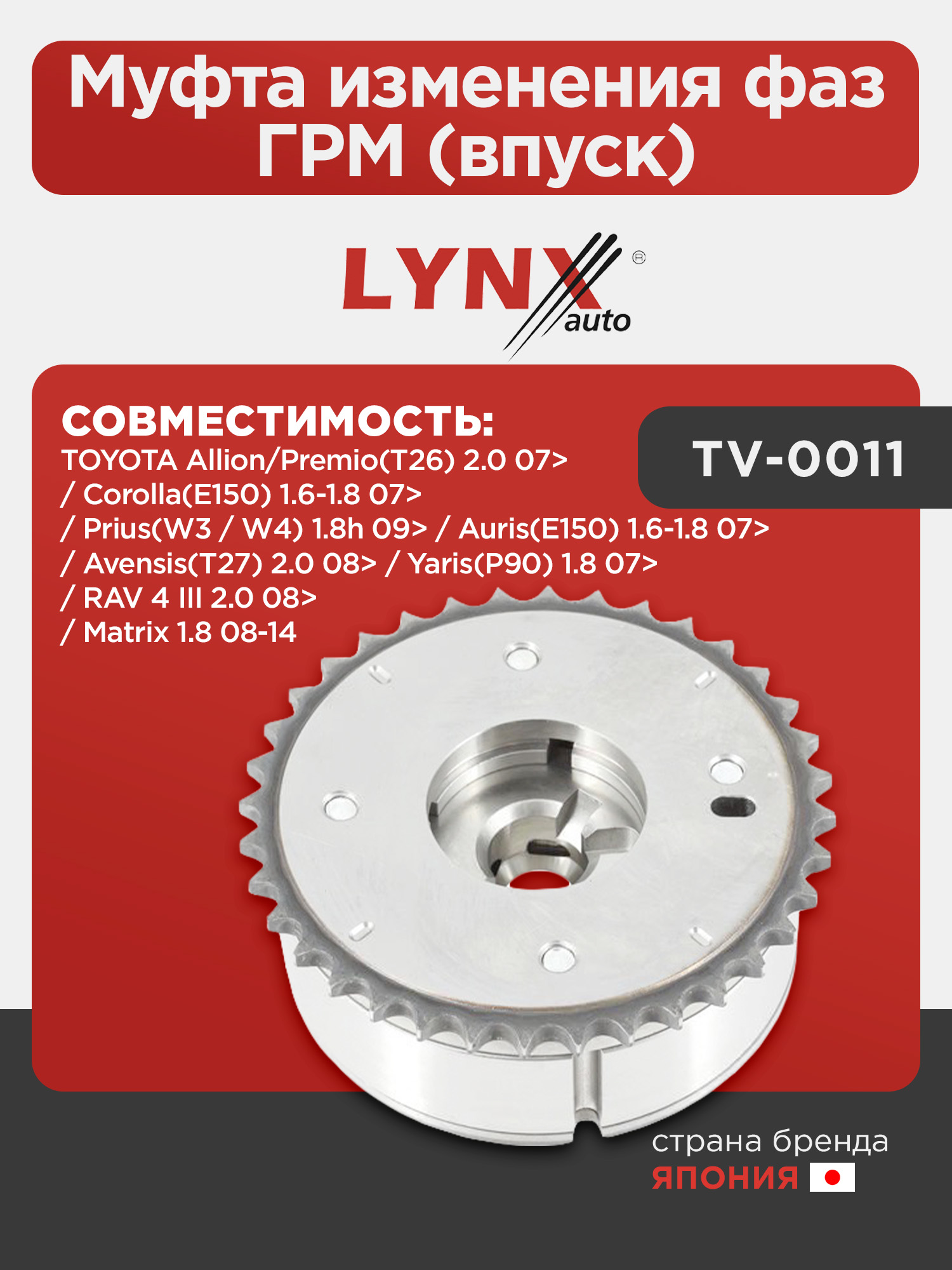 Муфта изменения фаз ГРМ (впуск) LYNXauto TV-0011. Для: TOYOTA Тойота Allion/Premio(T26) 2.0 07> / Auris(Аурис)(E150) 1.6-1.8 07> / Avensis(Авенсис)(T27) 2.0 08> / Corolla(Королла)(E150) 1.6-1.8 07> / Matrix(Матрикс) 1.8 08-14 / Prius(Приус)(W3 / W4) 1.8h