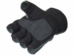 Ветрозащитные перчатки из полиэстера с PU вставками. У перчаток обрезаны пальцы для прямого контакта со снастью. На ладони есть усиление из противоскользящей ткани.