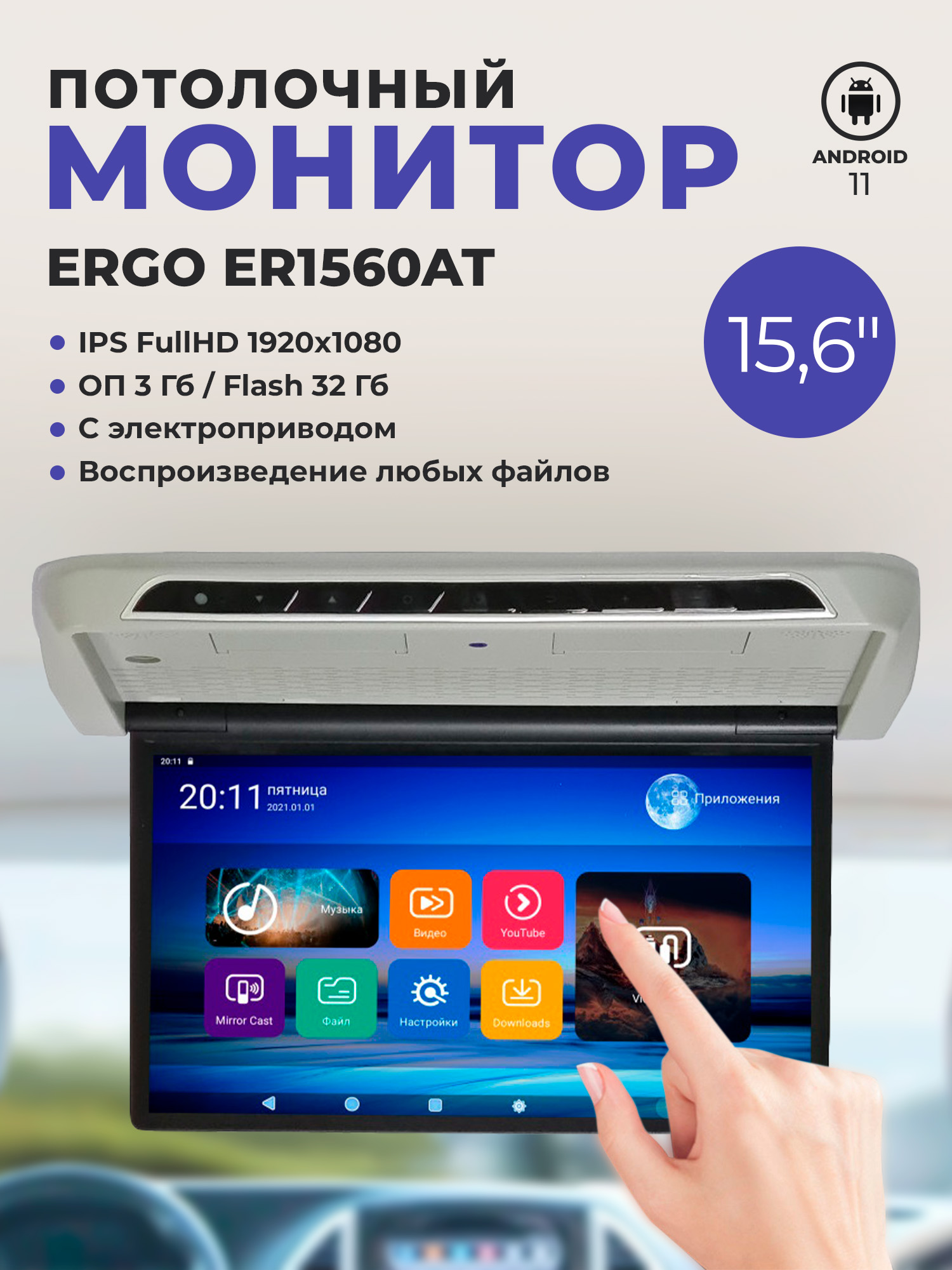 Воспроизведение любых файлов - Потолочный монитор ER1560AT поддерживает все аудио и видео кодеки. Больше не надо задумываться о том, прочитает ли монитор звуковую дорожку AC3. Не нужно сидеть и конвертировать файлы, чтобы в дороге не возникало проблем со звуком и видео. Скачали, включили и наслаждаетесь любимыми фильмами, передачами, мультфильмами. Wi-Fi и YouTube - В потолочном мониторе есть встроенный модуль Wi-Fi! Раздав интернет с телефона, или подключив монитор к мобильному роутеру, вы и ваши попутчики всю дорогу можете коротать время за, уже привычном и удобном для нас, YouTube или же можно сразу из меню перейти в онлайн кинотеатр Кинопоиск.