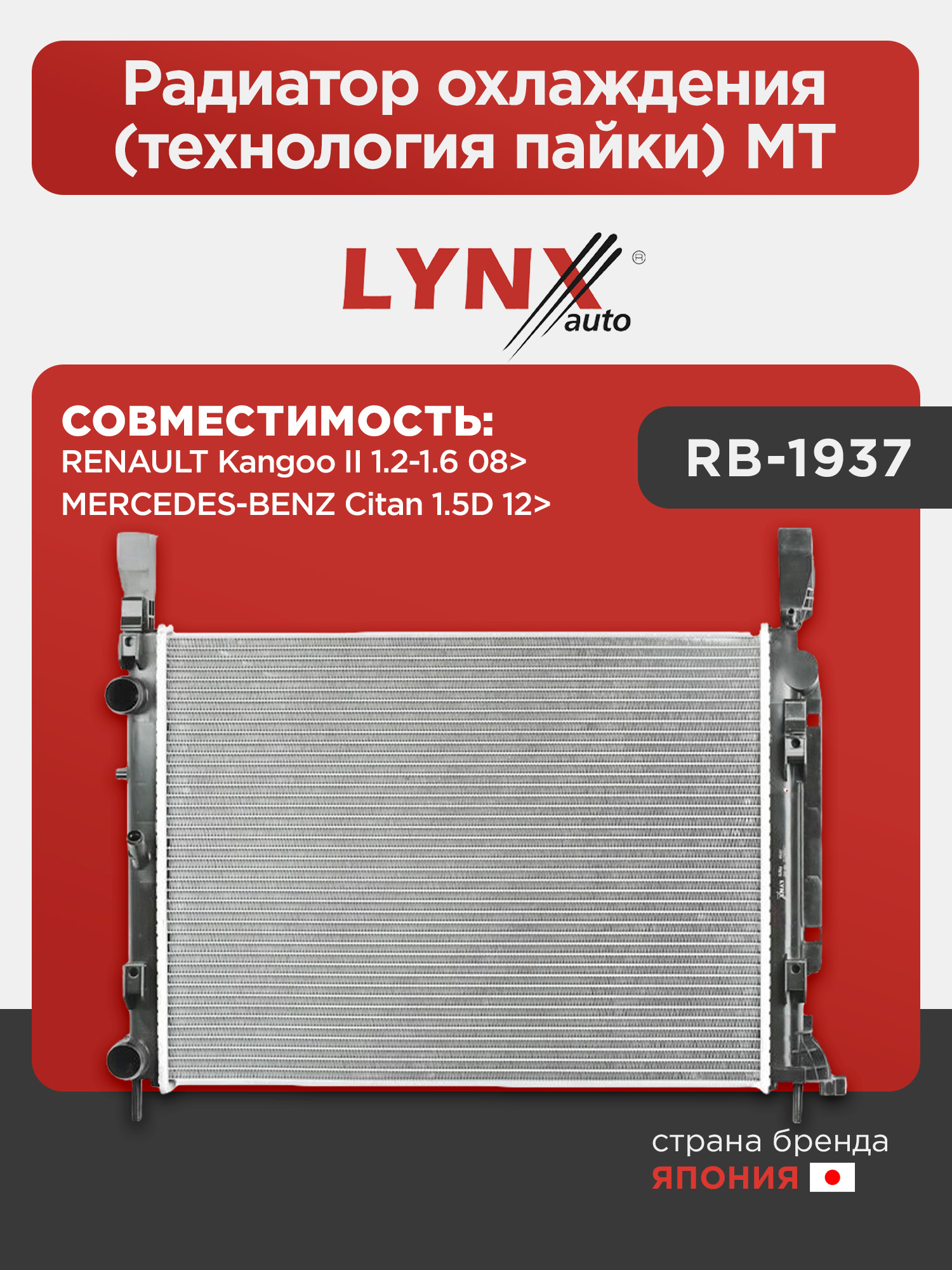 Радиатор охлаждения (технология пайки) MT LYNXauto RB-1937. Для: RENAULT Kangoo II 1.2-1.6 08>, MERCEDES-BENZ Citan 1.5D 12>
