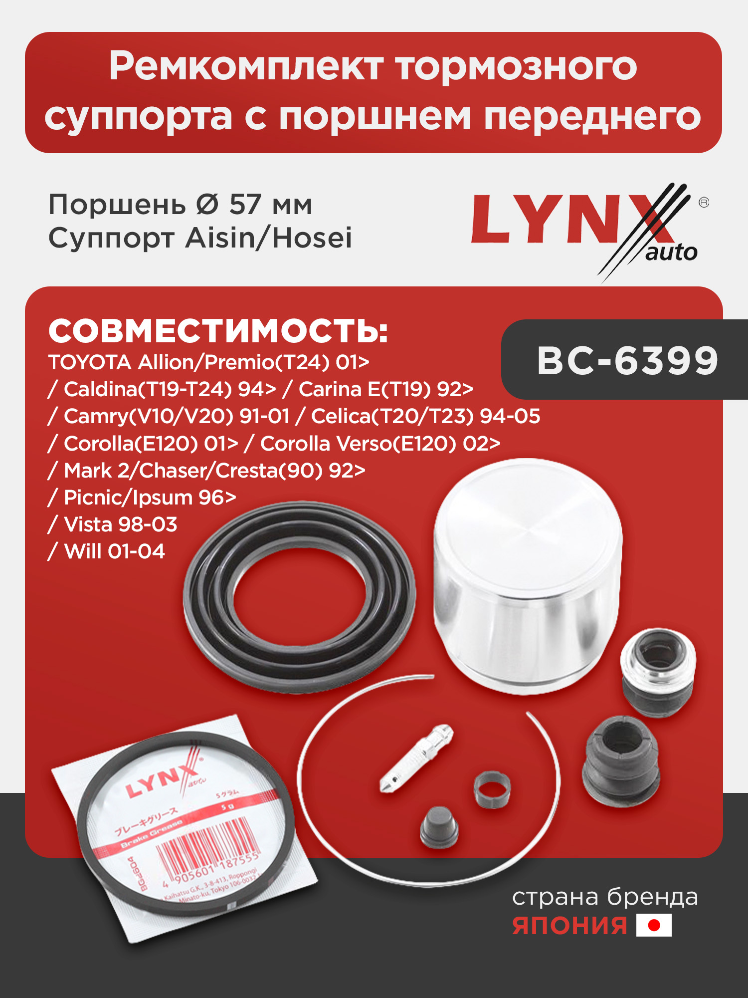 Ремкомплект тормозного суппорта с поршнем переднего (поршень Ø 57 mm, суппорт Aisin/Hosei) LYNXauto BC-6399. Применение: TOYOTA Allion/Premio(T24) 01> / Caldina(T19-T24) 94> / Camry(V10/V20) 91-01 / Carina E(T19) 92> / Celica(T20/T23) 94-05 / Corolla(E120) 01> / Corolla Verso(E120) 02> / Mark 2/Chaser/Cresta(90) 92> / Picnic/Ipsum 96> / Vista 98-03 / Will 01-04.