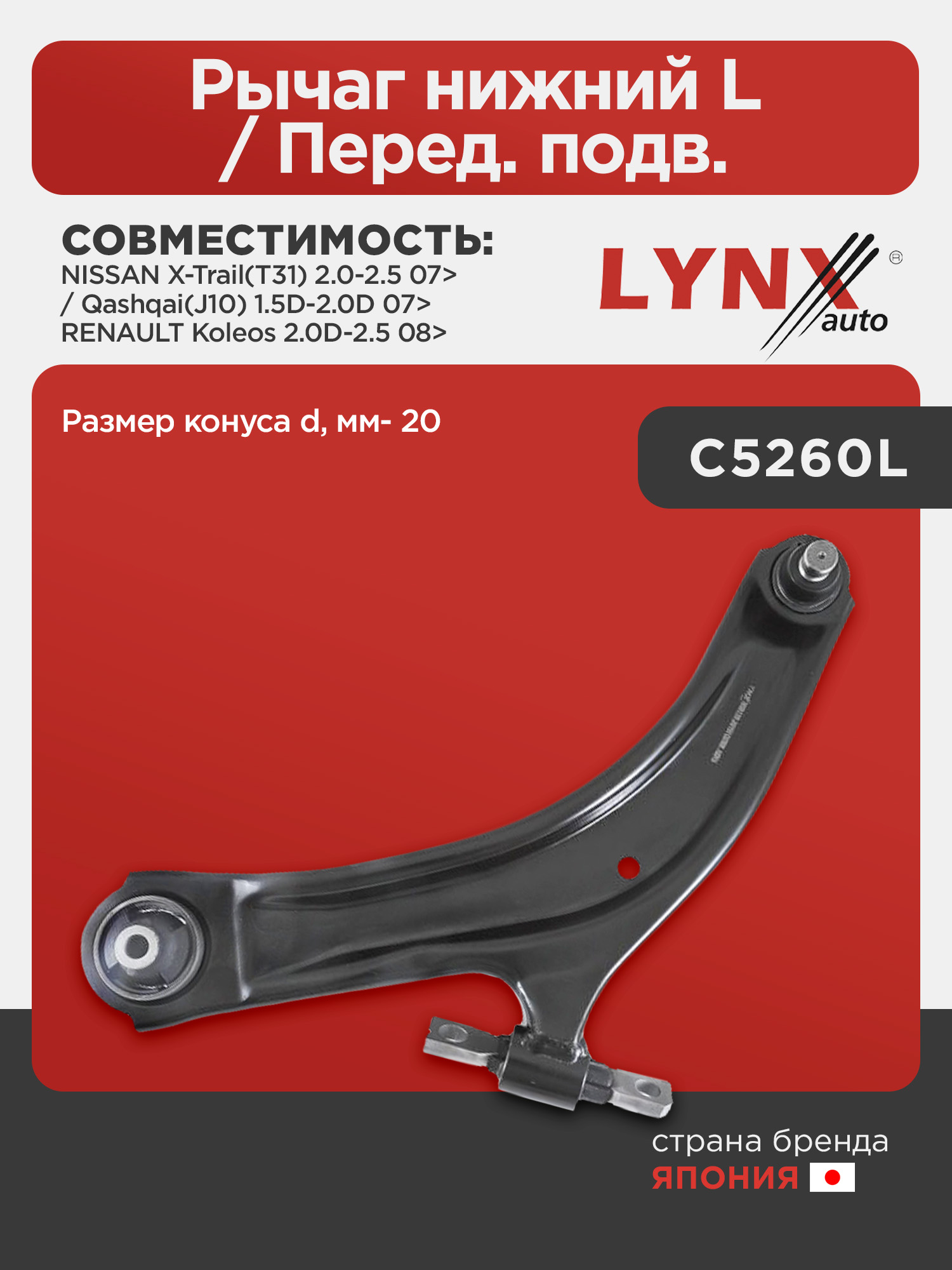 Рычаг нижний L / Перед. подв. LYNXauto C5260L. Применение: NISSAN X-Trail(T31) 2.0-2.5 07> / Qashqai(J10) 1.5D-2.0D 07>, RENAULT Koleos 2.0D-2.5 08>. Размер конуса d, мм- 20.