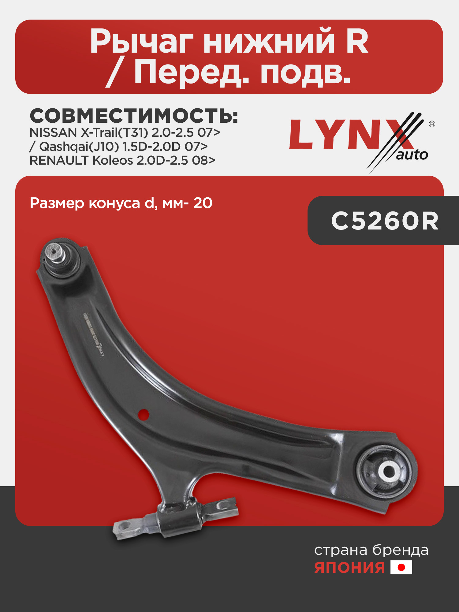 Рычаг нижний R / Перед. подв. LYNXauto C5260R. Для: Nissan, Ниссан, X-Trail(Икс-Траил)(T31) 2.0-2.5 07> / Qashqai(Кашкай)(J10) 1.5D-2.0D 07>, Renaul, Рено, Koleos 2.0D-2.5 08>. Размер конуса d, мм- 20