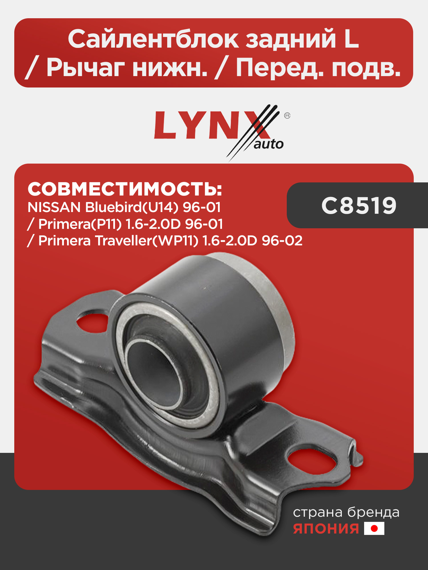 Сайлентблок задний L / Рычаг нижн. / Перед. подв. LYNXauto C8519. Для: NISSAN НИССАН Primera(P11) 1.6-2.0D 96-01 / Primera TRAV(РАВ)eller(WP11) 1.6-2.0D 96-02 / Bluebird(U14) 96-01