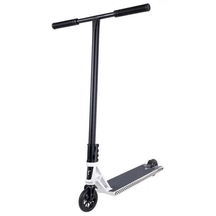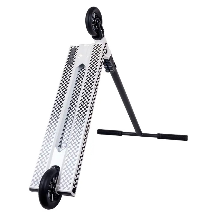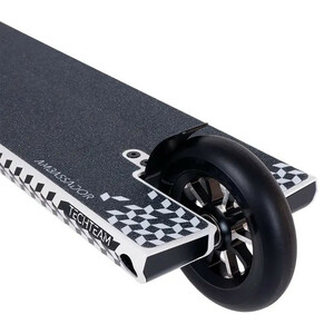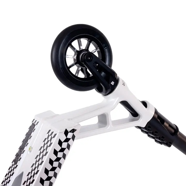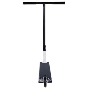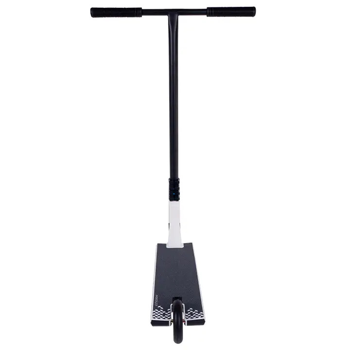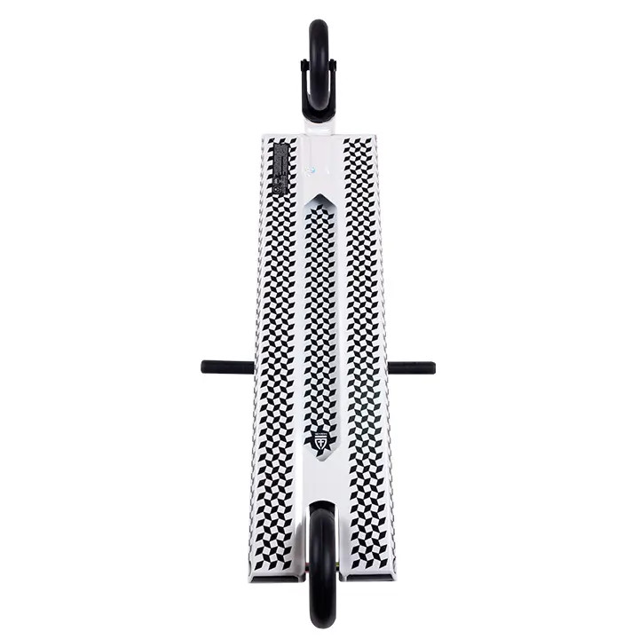 Стальной руль Т-образной формы удерживается четырех-болтовым зажимом на цельно-фрезерованной алюминиевой SCS вилке. Для обеспечения хорошего контроля при скольжениях на гранях и перилах, комплит оснащен широкой доской с квадратными окончаниями. Холоднокованный стакан изготовлен из единого алюминиевого бруса без сварных швов, что гарантирует его прочность. Колеса нестандартного размера: диаметр 115мм, а полиуретан немного выступает за диск и имеет ширину 26 мм. Внутри установлены высококлассные и быстрые подшипники ABEC 9.