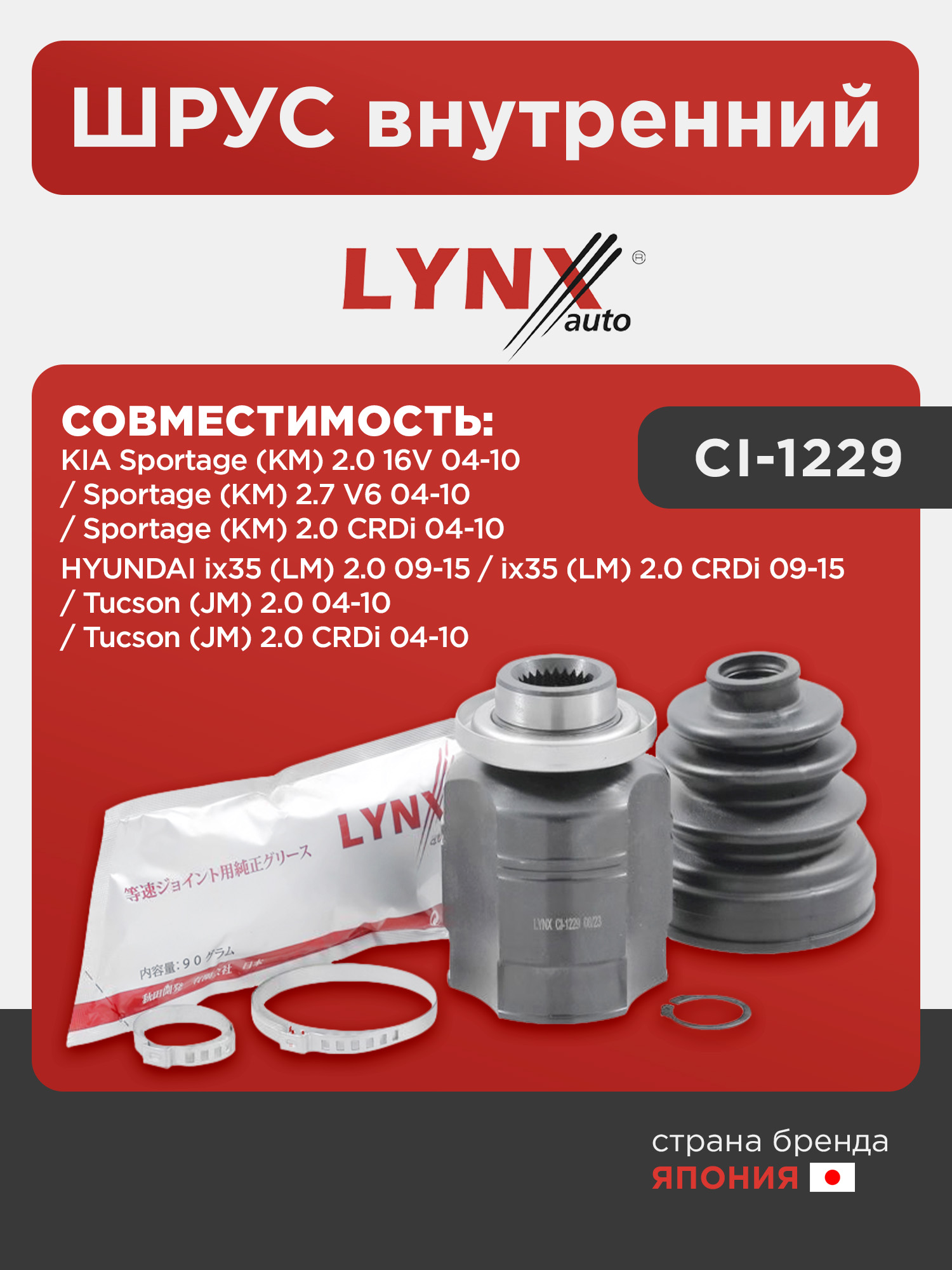 ШРУС внутренний LYNXauto CI-1229. Для: HYUNDAI Tucson (JM) 2.0 04-10 / Tucson (JM) 2.0 CRDi 04-10 / ix35 (LM) 2.0 09-15 / ix35 (LM) 2.0 CRDi 09-15, KIA Sportage (KM) 2.0 16V 04-10 / KIA Sportage (KM) 2.7 V6 04-10 / KIA Sportage (KM) 2.0 CRDi 04-10