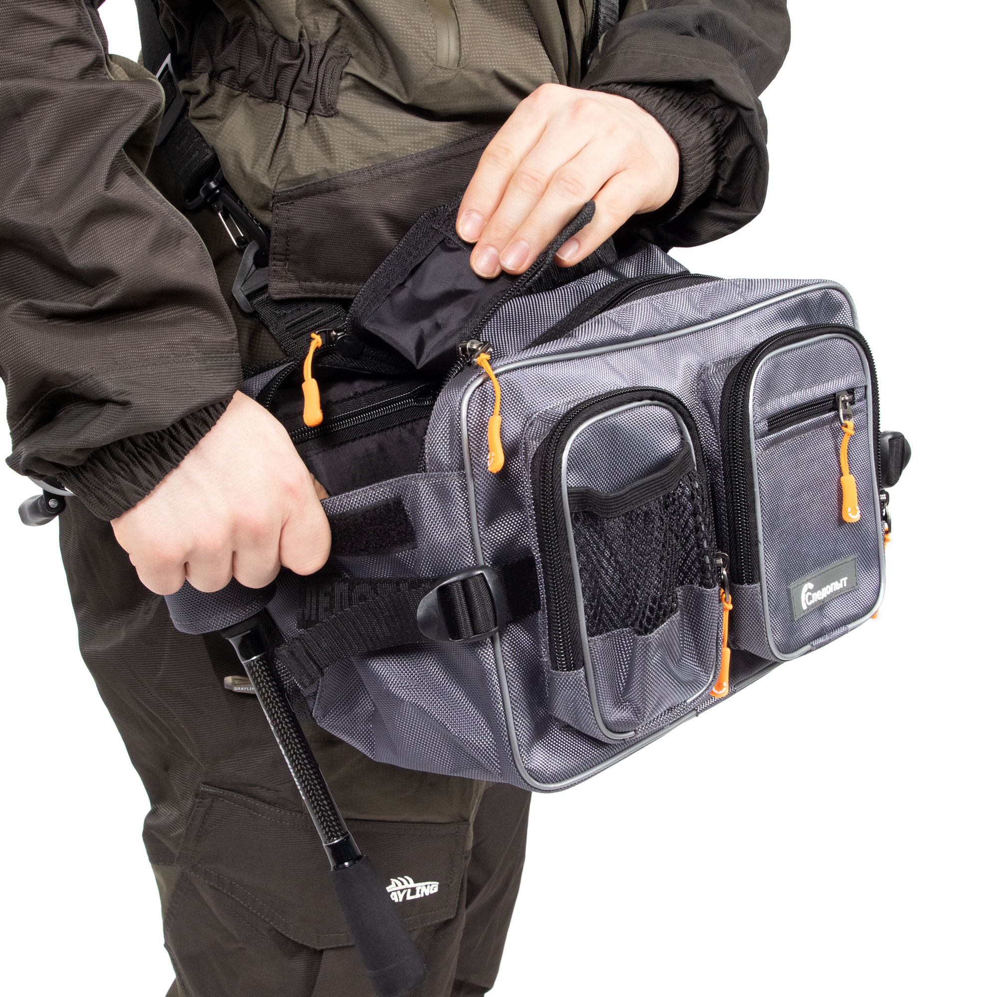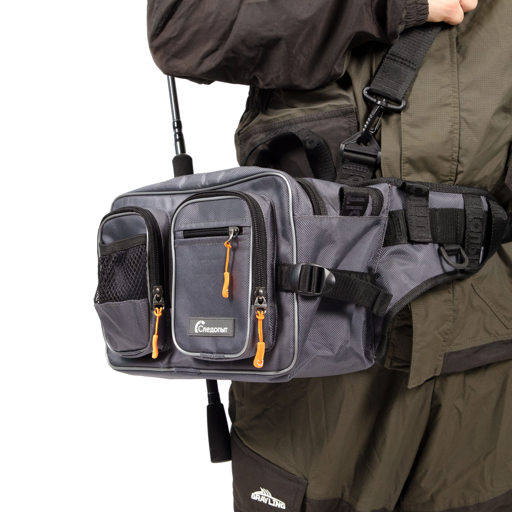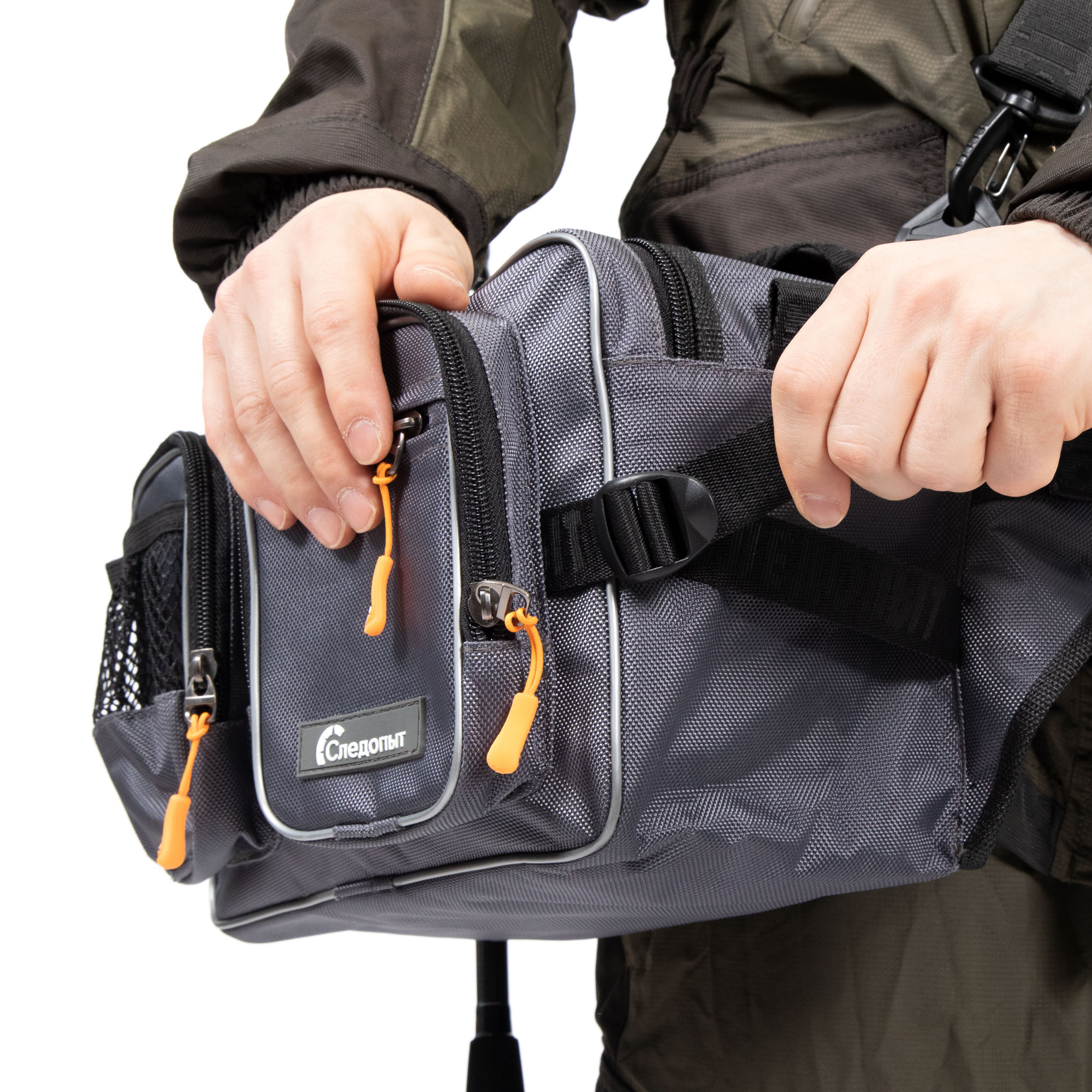 Сумка рыболовная поясная «Следопыт Fishing Hip Bag WBP» имеет одно объёмное центральное отделение и два внешних фронтальных кармана. Для крепления ретриверов и различных инструментов предусмотрены D-образные кольца. Сумка изготовлена из плотной и износостойкой ткани 1680D. Конфигурация сумки предназначена как для забродных видов ловли, так и для ловли в стиле «street-fishing». Мультипозиционная сумка предполагает носку на поясе, спине или груди.